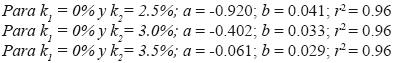 En todos los casos el coeficiente de determinación es de 0.96, lo que muestra un excelente ajuste. Esto significa que 96 por ciento se explica por la regresión, y sólo cuatro por ciento por los errores.