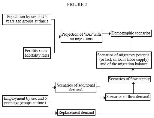 The model is articulated into two parallel paths: the first relates to the demographic side, the second to the labor market side. The two paths will then converge to produce demographic scenarios. In its complete form the procedure is based on a stockflow model of the labor market that allows estimating demographic and labor market variables by sex and age groups.