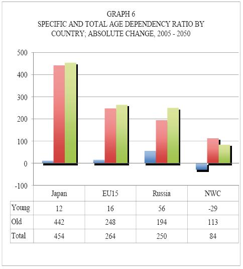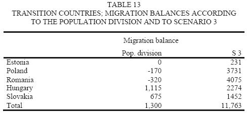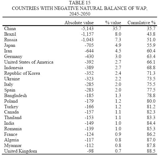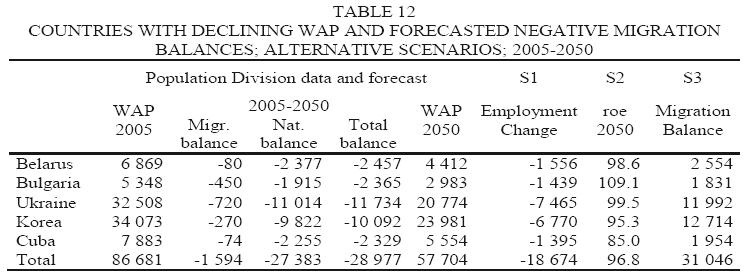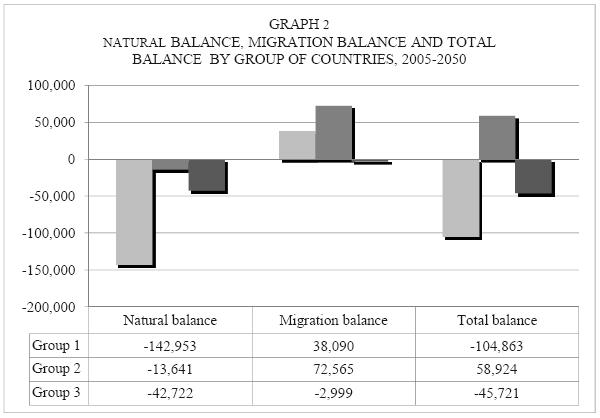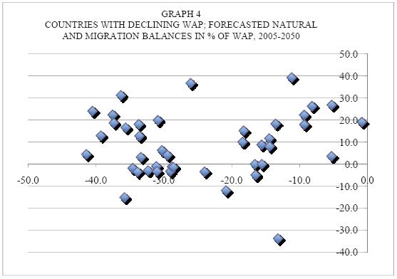 The first group of countries accounts for 71.7 per cent of the natural decline and for 35.4 per cent of the migration balance; the second group for 6.8 per cent of the natural balance, and for 67.4 per cent of the total inflow of immigrants; finally, the third group of countries accounts for 21.4 per cent of the natural decline in WAP, but will export labor to the other countries (graph. 3 (4) ).