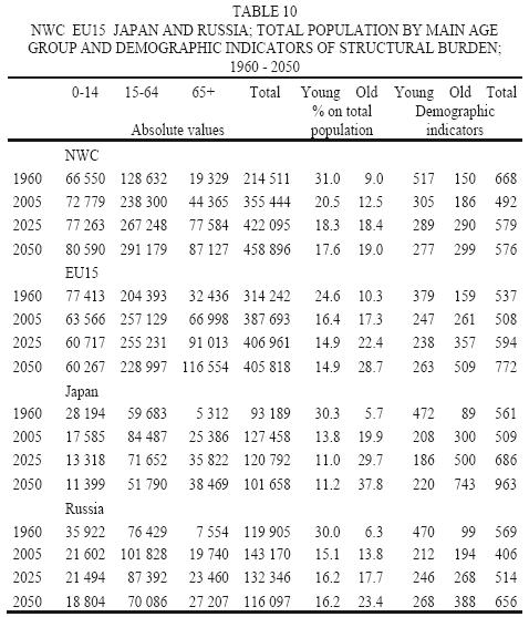 A second group of statements relates to issues that need to be confronted much more thoroughly both at the historical and local level and through the development of formal models. It has been shown that employment growth is the key factor to keep the structural burden under control, but also that employment growth generates net migrations above replacement level and will therefore contribute to notably increase the number of the elderly. At the same time, a selective mass migration policy could contribute to increase the number of births and therefore reduce, in due time, the unbalance between entries in to and exits from WAP, and therefore the manpower needs of demographic origin. This complex set of relationship should represent a relevant area of theoretical and empirical analysis greatly needed to connect development policies, migration policies, the reforms of the welfare system and the restructuring of the phases of life that will be imposed by the prolonging of the training phase and the lengthening of life expectancy.
