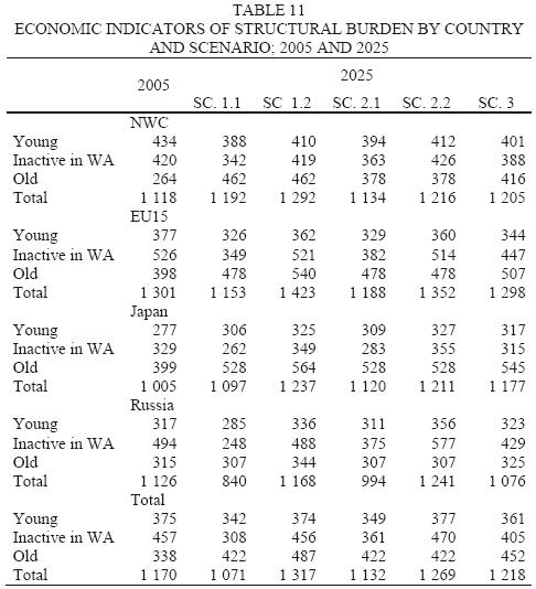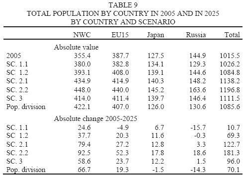 In order to capture the implications of the forecasting model we have just proposed, we have build scenarios for two countries, Japan and Russia, and for two large areas, the first including Australia, Canada and USA (the New World Countries), the second the countries in EU15. The choice of Japan and Russia is justified by their demographic and economic relevance and by the fact that they will be affected by a very pronounced decline of WAP.