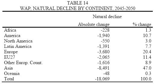 After progressively reducing the number of children, a decline in the number of births will provoke a progressive decline in the number of people in working age and therefore of the potential labor force. This phenomenon started in numerous developed countries toward the end of the XX century, but its full impact will become extremely more relevant in the XXI century. Table 1 reports the demographic projections made by the Population Division for 41 countries that will register a natural decline of their WAP between 2005 and 2050, together with the data for 19602005 period.12