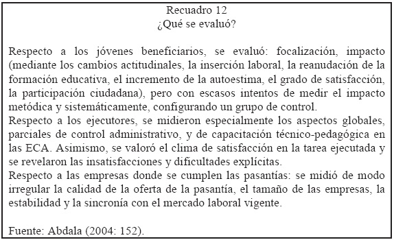 La evaluación de Programas de Formación para Jóvenes implica una serie de dificultades políticas, conceptuales y metodológicas. Entre las conceptuales pueden encontrarse los mayores desafíos: dada la multifactorialidad de estrategias en la implementación de los programas, se debe realizar un enorme esfuerzo para seleccionar las variables e indicadores imprescindibles y relevantes. En el recuadro 12 se presenta una sistematización de lo que se evaluó.
