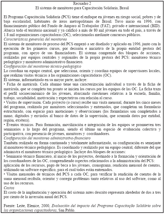 Para optimizar su utilidad, los sistemas de monitoreo y evaluación deben permitir aprendizaje y ajustes a lo largo del proyecto. La experiencia demuestra que el monitoreo es eficaz cuando incluye procesos participativos donde los beneficiaros tienen oportunidades de aportar sus impresiones durante su ejecución. Con la evaluación intermedia realizada a tiempo se pueden implementar los ajustes necesarios, lo que contribuye a que se obtengan mejores resultados. Se ejemplifica aquí con el sistema de monitoreo del Programa Capacitación Solidaria (recuadro 2).