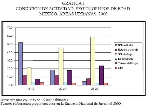 Un primer paso en este análisis consiste en explorar la condición de actividad de los jóvenes. La gráfica 1 presenta las actividades principales en las que se ocupan los jóvenes a distintas edades, encontrándose algunas de las tendencias esperadas. A medida que aumenta la edad disminuye la proporción de aquéllos que sólo estudian, mientras que se incrementa la de quienes se dedican exclusivamente a trabajar o a las tareas del hogar. Pero resulta de interés detenerse en algunos aspectos puntuales. En el grupo de 15 a 19 años sólo la mitad de los jóvenes se dedican exclusivamente a estudiar (51.8 por ciento); la otra mitad se encuentra integrada por jóvenes que o sólo trabajan (21.4 por ciento), que combinan el estudio con el trabajo (12.3 por ciento) o que están desocupados (3.9 por ciento) o son amas de casa (7.3 por ciento). Lo significativo es que una proporción importante (38 por ciento) del total de adolescentes ya se ha incorporado al mercado de trabajo, en la mayoría de estos casos abandonando definitivamente la escuela.