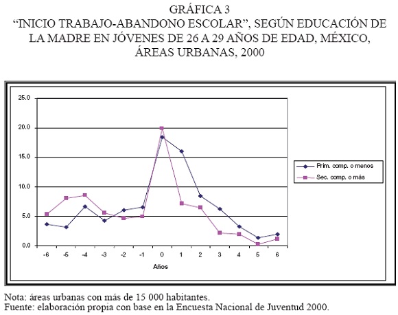 6 Del universo total de jóvenes de 26 a 29 años, 94.4 por ciento ya habían trabajado alguna vez y 82 por ciento ya habían abandonado la escuela. Efectivamente, se producen ciertos sesgos derivados del truncamiento de los jóvenes que continúan estudiando a estas edades y que fueron eliminados del análisis, los cuales además pertenecen mayoritariamente al nivel socioeconómico más alto (es decir, cuyas madres tienen educación secundaria completa o más). En este sentido, el análisis es simplemente indicativo, y lo que podríamos esperar si se tomara a este grupo unos años más tarde cuando todos hubiesen abandonado la escuela es que se hicieran más pronunciadas las tendencias que aquí se insinúan.