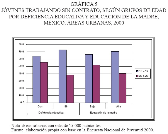 Si consideramos ya no la educación del propio joven trabajador, sino el nivel alcanzado por su madre (lo cual nos habla de sus condiciones de origen), la diferencia de velocidades en el descenso no es menos significativa. Entre los jóvenes cuyas madres tienen más educación, 70.3 por ciento carece de contrato a la edad de 15 a 19 años; la situación no es muy diferentes entre los hijos de madres con baja educación, pues el porcentaje es levemente inferior: 66.1 por ciento. Pero cuando observamos el grupo de 25 a 29 años de edad, vemos que en el nivel socioeconómico más alto ahora son 40.5 por ciento los que no tienen contrato, mientras que en los de origen socioeconómico bajo aún son más de la mitad (51.8 por ciento). Nuevamente ocurre lo mismo con las prestaciones.