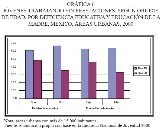 Las gráficas 5 y 6 nos muestran que cuando diferenciamos a los jóvenes según su condición educativa11 o el nivel de educación de la madre, esto no es así. Si bien, siguiendo la tendencia general, a mayor edad hay una disminución en el porcentaje de jóvenes que no cuentan con contrato ni con ninguna prestación en todos los subgrupos diferenciados, este descenso ocurre a velocidades claramente contrastantes. El porcentaje de jóvenes sin deficiencia educativa, que no tienen contrato en el grupo etáreo de 15 a 19 años es de 72.9 por ciento, y desciende a 38.6 por ciento en el grupo de 25 a 29 años; es decir, un descenso de casi la mitad. Entre los jóvenes con deficiencia educativa, la disminución entre ambos grupos de edad es de menos de 10 puntos porcentuales, tan sólo de 64 a 55.7 por ciento. Algo similar ocurre con las prestaciones.
