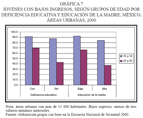 2 He tomado el nivel de educación de la madre como un indicador aproximado de las condiciones socioeconómicas en el hogar de origen. Siguiendo este criterio he diferenciado dos grandes grupos: los jóvenes cuyas madres tienen primaria completa o menos (esto incluye algún año de secundaria) y aquéllos cuyas madres tienen educación secundaria completa o más. El primer grupo representa 64 por ciento de los jóvenes de 15 a 29 años residentes en áreas urbanas, y el segundo, el 36 por ciento restante. Cabe señalar que esta estrategia no pretende definir con precisión clases socioeconómicas, sino simplemente diferenciar, a grandes rasgos, hogares de origen con condiciones socioeconómicas diferentes.