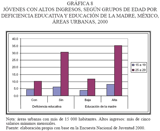 Si consideramos el nivel educativo alcanzado por los mismos jóvenes, veremos que la brecha entre grupos es aún más amplia. Para los adolescentes que trabajan, las diferencias socioeconómicas intracohorte parecen no tener mucho efecto sobre los ingresos; la absoluta mayoría de ellos, con independencia del nivel de educación que tengan o del estatus socioeconómico de sus hogares, reciben ingresos muy bajos: 91.6 por ciento de estos jóvenes con deficiencia educativa ganan menos de tres salarios mínimos, pero entre los jóvenes sin deficiencia educativa este porcentaje es apenas menor (87.4 por ciento). Cuando la brecha entre unos y otros realmente sufre un brusca ampliación es a la edad de 25 a 29 años; ahora 69.4 por ciento de los jóvenes con deficiencia educativa reciben menos de tres salarios mínimos al mes, mientras que entre aquéllos con más educación sólo 43 por ciento recibe este ingreso. Es más, si nos detenemos en la gráfica 8 veremos que para los jóvenes con deficiencia educativa está prácticamente vedada la posibilidad de recibir un ingreso mayor a cinco salarios mínimos (sólo uno de cada 10), mientras que 31 por ciento de los jóvenes que han superado este nivel educativo reciben dicho ingreso. Las mismas tendencias se observan respecto a la calificación del puesto de trabajo, cuyo análisis y gráficas no se presentan aquí por razones de espacio.