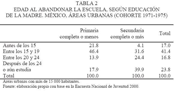 La condición socioeconómica del hogar tiene una asociación clara con la proporción de jóvenes que abandonan la escuela tempranamente. En la tabla 2 se presentan las edades en que abandonaron la escuela los jóvenes pertenecientes a la cohorte 1971-1975 de áreas urbanas, es decir, aquéllos que en el año 2000 tenían entre 25 y 29 años, y según el nivel de escolaridad de la madre.2 Cerca de 22 por ciento de los jóvenes cuya madre tiene educación primaria completa o menos abandonó la escuela antes de los 15 años, y otro 46 por ciento lo hizo entre los 15 y los 19 años. Es decir, siete de cada 10 jóvenes dejaron la escuela antes de alcanzar 20 años de edad. Entre los jóvenes cuya madre tiene educación secundaria completa o más, los porcentajes son de 4.1 y 31.6 por ciento, respectivamente. Es decir, en este grupo casi siete de cada 10 jóvenes continúa estudiando después de 19 años.