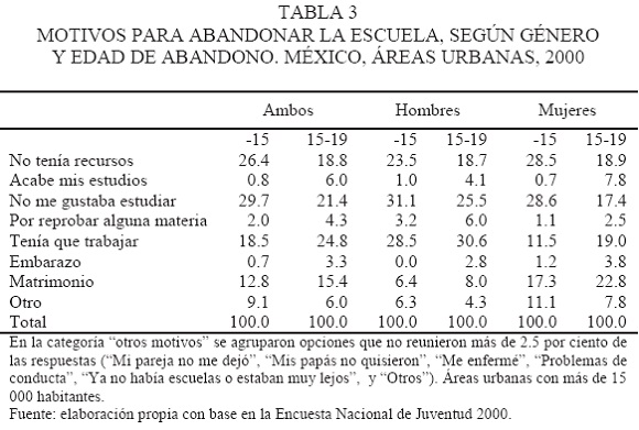 La segunda observación se refiere a los matices que introduce la condición de género. Mientras el trabajo aparece con un peso sustancial en las respuestas de los hombres, y marcadamente menor en las de las mujeres, lo opuesto ocurre con las respuestas que hacen referencia al ámbito familiar. Como puede verse en la tabla 3, "la necesidad de trabajar" se presenta como una motivación particularmente fuerte entre los hombres, mucho más que en las mujeres, lo cual sugiere una mayor centralidad (y a edad más temprana) del trabajo entre los hombres. En contraste, entre las mujeres cobra preeminencia, y con diferencias significativas respecto a los hombres, respuestas que se asocian con la transición familiar. En efecto, una de cada cinco mujeres que abandonan la escuela antes de los 15 años lo atribuyen al "matrimonio" o al "embarazo" (sólo 6.4 por ciento de los varones da esta respuesta),3 mientras que entre las que abandonan en el periodo que va de 15 a 19 años esta proporción sube a poco más de una cada cuatro, en tanto que entre los hombres es de sólo uno por cada 10.