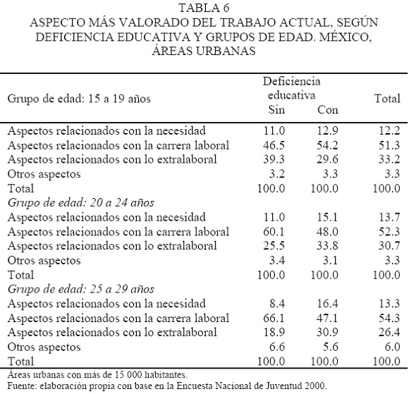 Sin embargo, a medida que aumenta la edad, estas preferencias van sufriendo cambios sustantivos. Tan es así, que ya en el grupo de 20 a 24 años, y más aún en el siguiente, la categoría que reúne los mayores porcentajes en los jóvenes con y sin deficiencia educativa se han invertido. En los jóvenes de 20 a 24 años, una alta proporción de aquéllos sin deficiencia educativa valoran los aspectos asociados con la carrera laboral (60.1 por ciento), y esto ocurre de manera aún más evidente en el grupo de 25 a 29 años, en el cual dos de cada tres jóvenes sin deficiencia educativa dan este tipo de respuesta. Como contraparte, los jóvenes con deficiencia educativa comienzan a privilegiar más los aspectos asociados con lo extralaboral (33.8 y 30.9 por ciento en los grupos de edad de 20 a 24 años y de 25 a 29 años, respectivamente). Incluso entre ellos cobra mucha fuerza la importancia del salario a medida que disminuye entre los más educados.