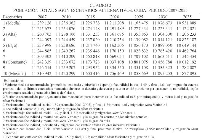 Se debe tener presente que el escenario uno ha sido tomado de la proyección oficial publicada en 2006 por el órgano estadístico cubano para los trabajos de planificación territorial y demás labores en las que se utiliza esta información, razón por la cual se obtuvo por agregación o suma de las proyecciones de cada provincia, mientras que el resto de los escenarios se elaboraron directamente, con proyecciones a nivel nacional. A pesar de haber usado el mismo software, esta diferencia metodológica introduce determinada variación en los cálculos, que aunque poco significativa desde el punto de vista estadístico, explica por qué la cifra de población del año 2007 en el escenario uno, es menor que la del escenario cinco (variante baja). Esto no constituye un obstáculo teniendo en cuenta que lo importante es analizar las características y tendencias generales.