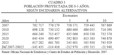 La población de cero a cinco años, que demanda los servicios médicos especializados de pediatría y de vías de enseñanza no formales, así como de guarderías o jardines infantiles, entre otros servicios, decrece en cualquiera de los escenarios analizados. En los 19 años comprendidos entre 2007 y 2025, dicha población disminuiría entre 114.4 mil y 213 mil personas de acuerdo con la variante baja y alta (los escenarios tres y cinco, respectivamente), siendo éstos los valores extremos probables que representan entre 14 y 28 por ciento de reducción de la población en la primera infancia existente en el país. El descenso en la variante constante (escenario ocho) es de 193.5 mil personas, y en el diez es tan sólo de 21.9 personas, pero se debe recordar que ambos tienen valor teórico y por tanto poca probabilidad de ser alcanzados en el periodo proyectado.5