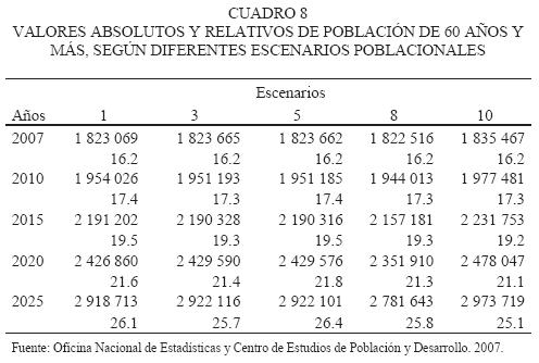 La parte más visible y conocida de la actual situación demográfica cubana es el envejecimiento poblacional, lo que comúnmente se interpreta como el aumento en la proporción de personas de 60 años y más de edad con respecto al total. En ese sentido, los escenarios analizados muestran cifras para 2007 muy similares, de poco más de 1.8 millones de personas en esas edades, lo que en términos relativos representa 6.2 por ciento del total. Hacia 2025, si bien las cifras absolutas de los escenarios más probables son igualmente similares (2.92 millones), en términos relativos el envejecimiento oscilaría entre 25.1 y 26.4 por ciento del total, respectivamente.