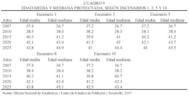 La edad media y mediana suele resultar un buen indicador para evaluar el envejecimiento poblacional. La edad promedio de la población cubana (edad media) para 2007 en cualquiera de los escenarios analizados se ubica en poco más de 37 años y para 2025 oscilaría entre 43 y 44 años, de acuerdo con los escenarios más probables. El escenario diez muestra valores para el indicador de 42.5, mientras que con el escenario ocho se ubicaría en 43.8 años de edad.