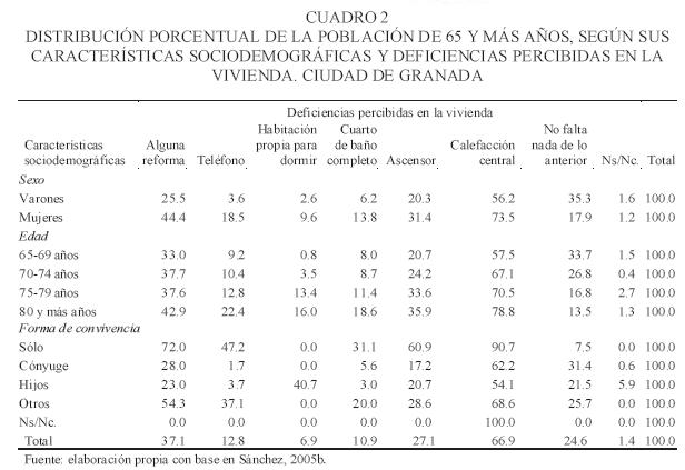 Tres de cada cuatro ancianos presentan deficiencias en sus domicilios (73.8 por ciento), sobre todo, mujeres de 75 años y más, viudas, que viven solas, tienen bajos ingresos y residen en una vivienda de alquiler con 50 años y más (cuadro 2). Entre las carencias más comunes que presentan las viviendas habitadas por personas ancianas destacan la necesidad de reformas (humedades, grietas, goteras, deficiencias en la red eléctrica, agua y gas, problemas de ventilación) (37.1 por ciento) y la eliminación de barreras arquitectónicas, tanto dentro como fuera de la vivienda, como pasillos estrechos para el tránsito de una silla de ruedas, escaleras dentro del domicilio, ausencia de rampas y falta de ascensor para acceder al domicilio (27.1 por ciento). Constatamos que la ausencia del ascensor condiciona la accesibilidad a espacios y servicios urbanos, y también repercute de manera negativa en sus relaciones sociales y familiares (aislamiento, soledad). En muchos casos, la propia vivienda se convierte en una verdadera prisión. Asimismo, la carencia de teléfono (12.8 por ciento) confiere al anciano la imposibilidad de estar en contacto con familiares, amigos y otros servicios (emergencias, servicios sociales), sin salir de casa. También, la falta de calefacción (66.9 por ciento) repercute en la salud del adulto mayor durante los fríos inviernos, al incrementarse el riesgo de enfermedades (hipotermia, dolores articulares, reumatismo) y el peligro de incendio (estufas en mal estado). Aunque sólo 10.9 por ciento de las personas ancianas admite no contar con cuarto de baño completo, dicha tasa se eleva hasta 37.1 por ciento para las personas que necesitan reformas y adaptaciones en su baño.