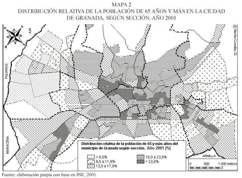 En la desigual distribución espacial del envejecimiento demográfico a nivel municipal se registra un mayor envejecimiento relativo (> 23.9 por ciento) en las secciones censales de los barrios y distritos del centro urbano (Centro, Albaicín y Ronda) (mapa 2), favorecido por la expulsión de la población joven hacia la periferia en búsqueda de vivienda. Mientras, las menores tasas de envejecimiento (< seis por ciento) se localizan en las secciones censales de los barrios y distritos periféricos (Ronda, Chana y Zaidín), densamente poblados y localizados en el borde oeste del casco urbano. Como en otras ciudades (Sargatal, 2001), la inmigración (marroquí) y los procesos de gentrificación han contribuido a reducir la tasa de envejecimiento en algunos barrios centrales (Albaicín).
