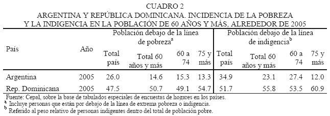 En Argentina, según datos de la Cepal, el porcentaje de ancianos que vive por debajo de la línea de la pobreza es menor que el de los grupos de edad más jóvenes. Esta situación es probablemente una consecuencia de las condiciones de bienestar presentes en ese país hasta la década de 1970, lo cual llevó a la acumulación de activos y, por ende, a asegurar una jubilación o pensión a las personas al llegar a la edad adulta mayor, así como a disponer de una vivienda propia. En República Dominicana, en cambio, la situación se invierte. Es mayor la proporción de personas mayores por debajo de la línea de la pobreza que la de personas adultas jóvenes en esta condición. El porcentaje de personas mayores que se encuentran por debajo de la línea de la pobreza es mayor que el de adultos jóvenes. Esto implica una mayor vulnerabilidad de los adultos mayores dominicanos (cuadro 2) debido a la falta de políticas concretas de apoyo a la población anciana durante muchos años y a problemas económicos de larga data. De esta manera, a pesar de la reciente inclusión en la seguridad social emergente en el país, la cobertura sigue siendo baja para esta población en la República Dominicana (menos de 20 por ciento).