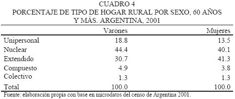 Por otro lado, en los hogares rurales argentinos hay una mayor proporción de hombres mayores que viven solos en comparación con las mujeres. Esto se debe probablemente a la situación de mayor aislamiento familiar en la que viven los trabajadores rurales, tal vez por la migración de sus descendientes, tanto a las zonas urbanas, como al extranjero.