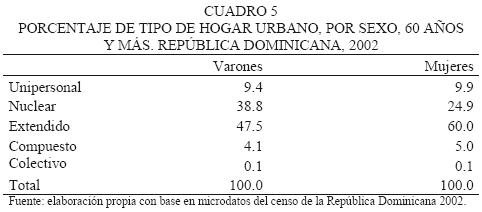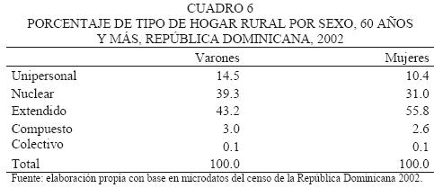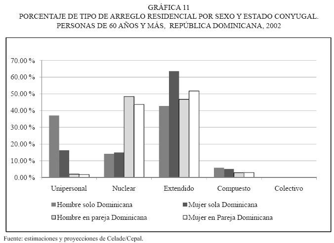 La organización de la familia de los adultos mayores en República Dominicana repite el patrón de una mayor presencia de los hombres en hogares nucleares y una presencia mayor de las mujeres en hogares extendidos. El hecho notable, a diferencia de Argentina, es que la proporción de mujeres que viven solas no difiere de los hombres, pero en un porcentaje mucho menor que en Argentina. En ese sentido, parece que las mujeres dominicanas, una vez viudas, es más probable que pasen a vivir en hogares extendidos que en un hogar unipersonal. 60 por ciento de las mujeres mayores de zonas urbanas vive en hogares extendidos. Como en Argentina, en República Dominicana se observó nuevamente una mayor proporción de hombres mayores que viven solos en los hogares rurales, probablemente por la misma circunstancia que se menciona en Argentina.