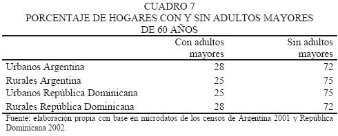 Por último, también es importante resaltar el porcentaje de hogares con adultos mayores en ambos países, como se muestra en el cuadro 7. Este cuadro muestra que a pesar de que Argentina es un país más envejecido y cuenta con una mayor proporción de adultos mayores, en República Dominicana, curiosamente, los porcentajes de hogares con adultos mayores en zonas rurales y urbanas son los mismos.