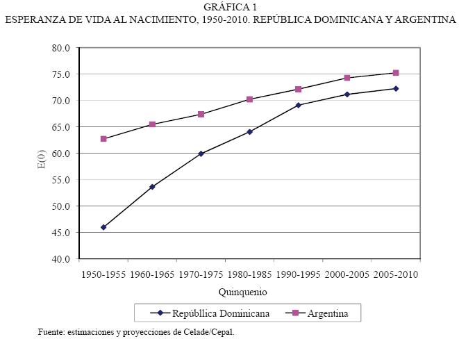 En el caso de la Argentina, la esperanza de vida para ambos sexos aumentó de 62.7 años en 19501955 a 75.2 en el periodo 20052010, lo que representa un aumento de alrededor de 20 por ciento. Mientras en República Dominicana, cuya esperanza de vida en el comienzo de ese periodo fue mucho menor, se elevó de 46 años en 19501955 a 72.6 en 20052010, mostrando un aumento de más de 50 por ciento y mostrando un leve descenso a mediados del periodo 20002005. Estos resultados se explican por la alta mortalidad infantil que hubo en este país del Caribe durante la década de 1950 y el fuerte impacto sobre la esperanza de vida, cuyo declive empezó a mediados de la década de 1970, para luego aumentar marcadamente entre 1980 y 1985, comenzando a disminuir nuevamente durante la década de 1990. A partir de entonces, ha continuado reduciéndose a un ritmo mucho menor (gráfica 1).