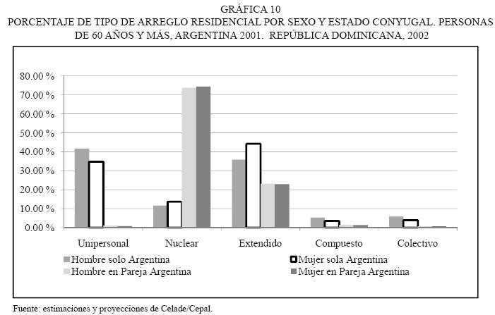 Las gráficas también muestran que existe una preferencia de los adultos mayores argentinos por vivir en hogares nucleares y de los adultos mayores dominicanos en hogares extendidos. Se enfatiza que por cada 10 mujeres dominicanas sin pareja, seis de ellas viven en hogares extendidos.