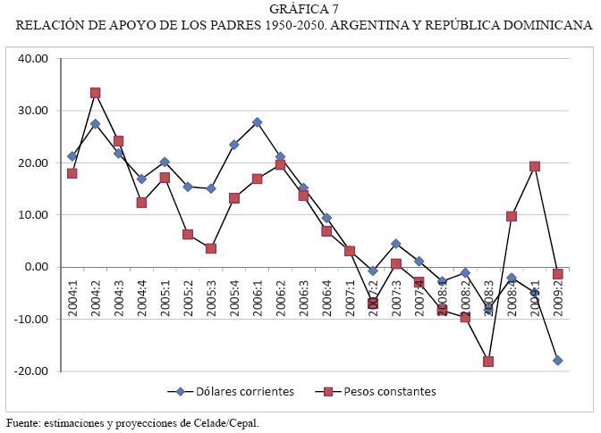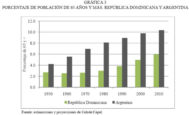 Los datos analizados indican claramente las diferencias en la etapa del proceso de envejecimiento y la situación de los adultos mayores en los países estudiados. Argentina está en una etapa avanzada de transición demográfica y constituye una población ya envejecida desde la década de 1970. Sin embargo, en este país el proceso de envejecimiento no será en los próximos años tan acelerado como en la República Dominicana, la cual registra una caída más abrupta de la fecundidad (TGF de 7.6 en 1950 a 2.8 en 2005). La situación de los adultos mayores en la República Dominicana refleja un país que está acelerando su proceso de envejecimiento de la población.