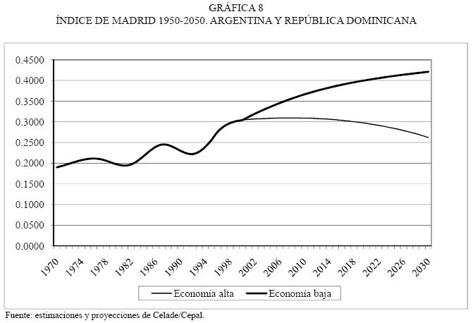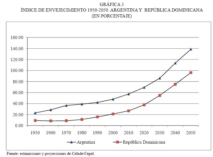 Desde la década de 1990, ambas curvas se mantuvieron en aumento, aunque inicialmente Argentina presentó niveles más elevados de su índice de envejecimiento. Alrededor del año 2040, según las proyecciones, Argentina va a presentar un valor de este índice por encima de 100. Eso significa que habrá más de una persona de 60 años por cada niño menor de 15. Esta situación se observará en República Dominicana sólo después de 2050. Este fenómeno tendrá repercusiones profundas en la vida de las familias y en la organización de la seguridad social, toda vez que desde ese momento habrá más abuelos que nietos en la población.