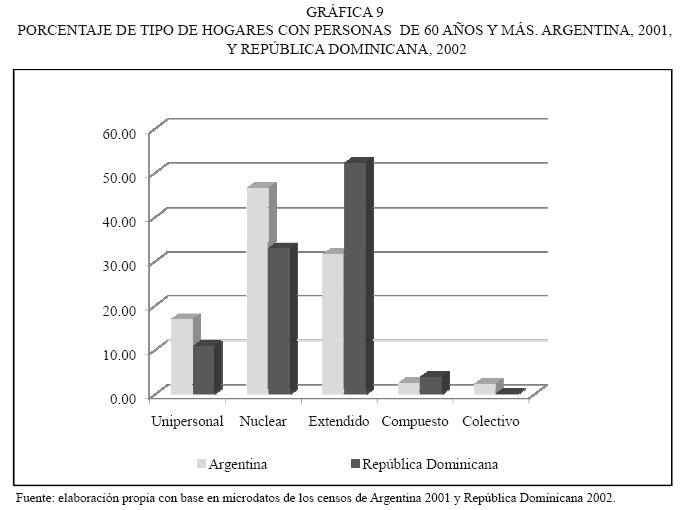 La proporción se invierte con respecto a la proporción de personas mayores en hogares extendidos (52 por ciento de los hogares dominicanos, en contraste con más de 32 por ciento de hogares argentinos). Los hogares compuestos con personas mayores son escasos en ambos países: cuatro por ciento en los hogares dominicanos y tres por ciento en Argentina.