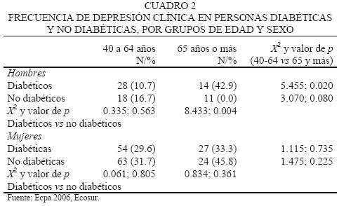 Adicionalmente, la sintomatología depresiva se registró con mayor frecuencia en los hombres diabéticos de 65 años o más; uno de cada cinco reportó ideación suicida y en general se sienten más solos, tristes, desesperanzados y con menor autoestima, entre otros síntomas, respecto a los no diabéticos o con relación a las mujeres diabéticas. Estos síntomas afectan en promedio a la mitad de los hombres diabéticos y este hecho, por sí mismo, también podría contribuir a disminuir la esperanza de vida, ya que se ha sugerido que la depresión se asocia a la mortalidad temprana, especialmente en los hombres (Kaarin et al., 2002: 884886; Katon et al., 2005: 26702671). Sin embargo, igualmente manifiesta, de manera indirecta, el efecto crónico de la disrupción en el proyecto de vida o en las actividades cotidianas ocasionadas por la diabetes.