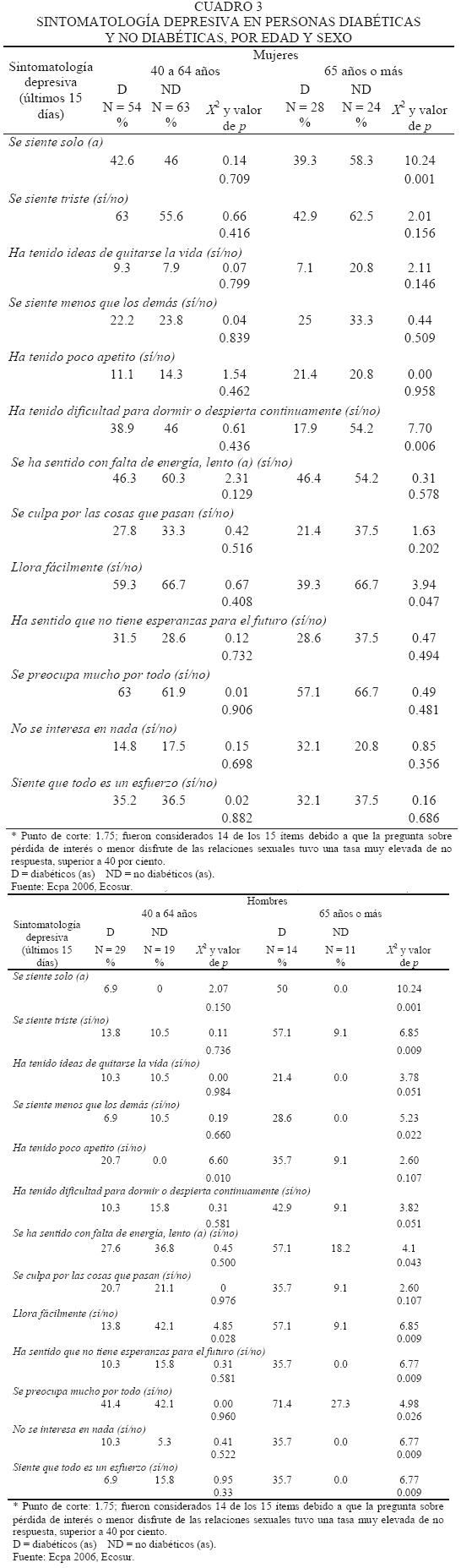 La depresión es más severa en los hombres diabéticos de mayor edad (65 o más años), ya que registran significativamente mayor frecuencia de sensación de soledad (50 por ciento), tristeza (57.1 por ciento), desinterés (35.7 por ciento), dificultad para dormir (42.9 por ciento), falta de energía (57.1 por ciento), preocupación excesiva (71.4 por ciento), desesperanza (35.7 por ciento) y llanto fácil (57.1 por ciento), así como pérdida de la autoestima (28.6 por ciento), que su grupo de comparación. Esas cifras también son superiores a las de las mujeres diabéticas del mismo grupo de edad (cuadro 3).