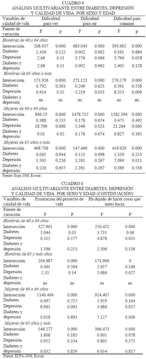 Para evaluar las relaciones múltiples entre las variables: diabetes y depresión con la calidad de vida, se realizó un análisis multivariante. Los resultados muestran que la diabetes y la depresión en los hombres jóvenes se asociaron estadísticamente con la frustración del proyecto de vida y el abandono de actividades cotidianas, así como con la pérdida de las funciones. En las mujeres jóvenes y mayores y en los hombres mayores la diabetes no tuvo un efecto significativo en la calidad de vida, pero sí la depresión (asociada a la diabetes), especialmente en los hombres (cuadro 6). En ninguno de los casos se observó un efecto de interacción entre diabetes y depresión.