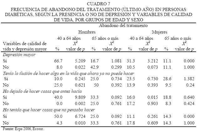 ¿Modifican la depresión y los distintos aspectos de la calidad de vida la probabilidad de seguir el tratamiento? Es evidente que la depresión incrementa la probabilidad de abandono del tratamiento, lo que coincide con los reportes de otros estudios. Sin embargo, en este trabajo, la relación entre la depresión y el abandono del tratamiento fue significativa en hombres y mujeres diabéticos jóvenes; así, los hombres diabéticos deprimidos de 40 a 64 años de edad registraron 8.3 veces mayor probabilidad de abandonar el tratamiento respecto a los no deprimidos, mientras que las mujeres diabéticas jóvenes deprimidas tuvieron una probabilidad tres veces mayor respecto a las diabéticas no deprimidas. En los hombres y mujeres diabéticos de 65 años o más de edad, la depresión no registró una relación significativa con el abandono del tratamiento (cuadro 7).