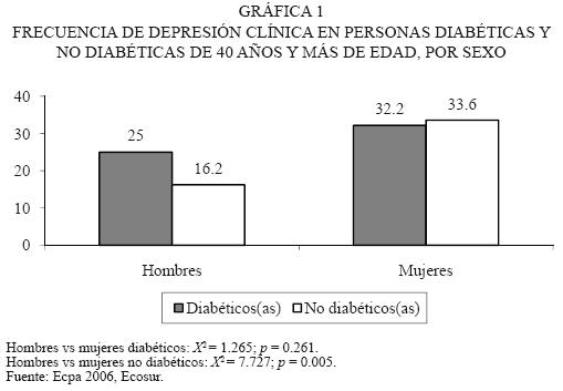 La frecuencia de depresión clínica fue mayor en las mujeres (32.2 por ciento) que en los hombres diabéticos (25 por ciento), sin diferencias significativas (p = 0.261) (figura 2), lo que coincide con lo reportado por Ryan et al. (2001: 1070). Sin embargo, la comparación de la frecuencia de depresión entre personas diabéticas y no diabéticas permite apreciar que la diabetes mellitus tipo 2 incrementa la probabilidad de padecer depresión en los hombres pero no en las mujeres. Esto último se ve documentado porque cuando se comparan hombres y mujeres no diabéticos sí existen diferencias significativas en la frecuencia de depresión, la cual es mayor en las mujeres; esta diferencia desaparece al comparar hombres y mujeres diabéticos, a expensas de un incremento de la depresión en los hombres (gráfica 1).