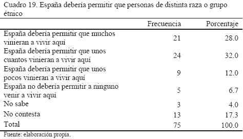 • Los encuestados están de acuerdo en que el gobierno permita que vengan personas de otros países a vivir a España (72 por ciento); si bien este permiso se matiza en muchos, unos cuantos o unos pocos, son prácticamente inapreciables los que se niegan abiertamente a que no entre nadie (6.7 por ciento).