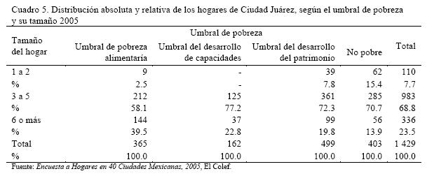 Existe un debate añejo acerca de la relación entre tamaño del hogar e ingreso. Chayanov (1985) consideraba que durante las necesidad económica, los hogares grandes tienen la posibilidad de enviar miembros al mercado de trabajo, por lo tanto éstos son los que tienen ingresos más altos (Sandez, 2006), pues finalmente dentro del hogar es donde se decide la participación de éstos en las actividades productivas (González, 1986). En el caso de Ciudad Juárez los hogares son pequeños, ya que 77.2 por ciento en el desarrollo de capacidades, 72.3 por ciento en el desarrollo del patrimonio y 58.1 por ciento en pobreza alimentaria tienen entre tres y cinco miembros. Esto es que tienen pocas posibilidades de enviar miembros al mercado de trabajo, lo que de manera importante explica la situación de pobreza en la que se encuentran.