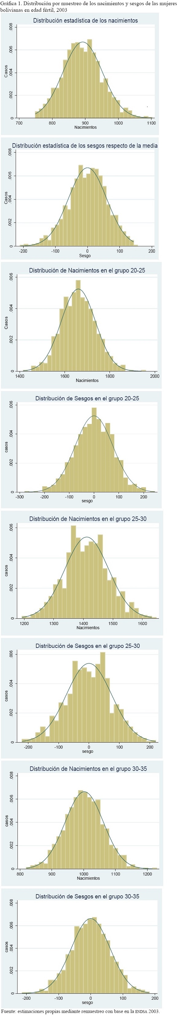 El análisis de sensibilidad nos ha dado interesantes resultados que no hubiésemos podido observar con los métodos tradicionales. En primer lugar se cuenta con información base de las distribuciones por muestreo de la TGF, así como de los nacimientos de los siete grupos quinquenales de edad, es decir, se ha generado mayor información acerca de las distribuciones de los nacimientos de las mujeres bolivianas en 2003. Por otro lado, se ha podido construir un índice para evaluar la normalidad, así como la heterogeneidad y dispersión de la distribución del estimador de los nacimientos por grupos quinquenales de edad.