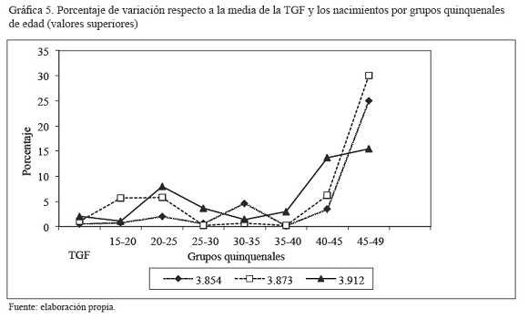 Analizando las variaciones por encima de la media de la TGF a 0.5, uno y dos por ciento, también se encuentra que las variaciones en porcentaje son superiores y diferentes para los grupos quinquenales con la coincidencia de que en los grupos 6 y 7 este porcentaje de variación se dispara mayor a 20 por ciento, al igual que en el anterior grupo de análisis.