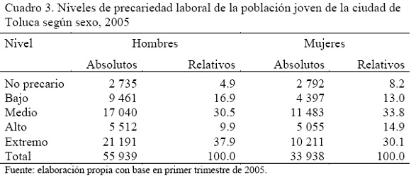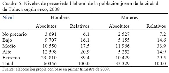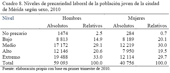 Paralelamente, la proporción de población joven que se ubica en el nivel extremo de precariedad laboral siempre resultará preocupante, en el primer trimestre de 2010 este nivel continúa absorbiendo la mayor cantidad de jóvenes, para la ciudad de Toluca 36.4 por ciento de mujeres jóvenes se ubica en dicho grado de precariedad laboral, contra 33 por ciento de los jóvenes; la situación en Mérida no es mejor, pero si diferente, en esta ciudad se ubica 33 por ciento de los varones en el nivel extremo de precariedad, contra 29.7 por ciento de mujeres (Cuadros 7 y 8).