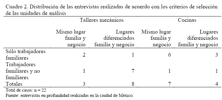 Fueron entrevistados 22 propietarios y propietarias de pequeños establecimientos en la Ciudad de México; once pertenecientes al rubro de restaurantes o negocios de comida y los once restantes ubicados en el giro de los talleres mecánicos. El escenario de la Ciudad de México hizo posible estudiar varios aspectos de la dinámica del mercado de trabajo en un contexto concreto de desarrollo de gran parte de los problemas que aquejan a los micronegocios.