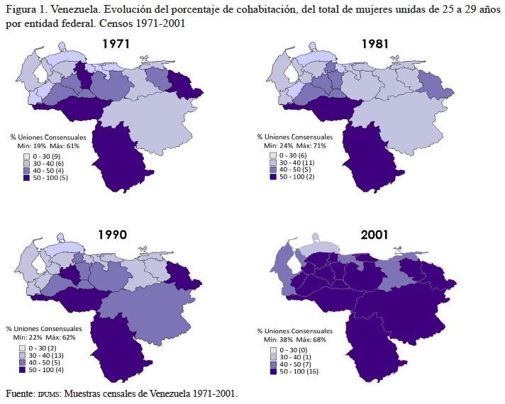 Entidades con menos de 30 por ciento de cohabitación en 1971: Mérida, Táchira, Distrito Capital, Miranda, Carabobo, Aragua, Vargas, Nueva Esparta y Falcón