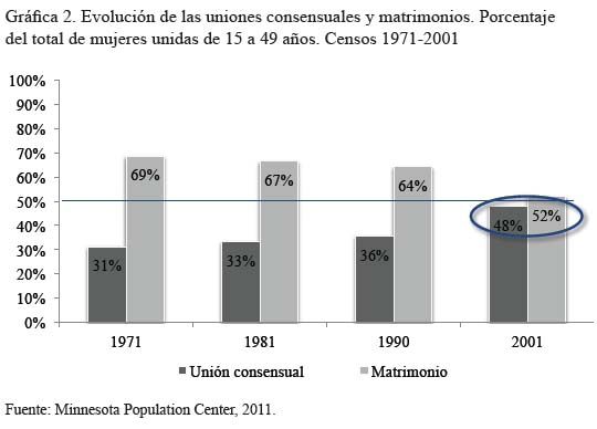Sin embargo, los incrementos más extraordinarios se dan entre las mujeres con más de seis años de educación y particularmente entre las bachilleres (de nueve a 12 años de escolaridad) y las universitarias. Aquellas con seis a ocho años de estudios aumentaron sus niveles de cohabitación en 2001 tres veces respecto a su valor en 1971. Este crecimiento fue de 15 veces para aquellas con secundaria aprobada y de diez veces para las universitarias. De nuevo resalta el hecho de que las mayores variaciones se dieron entre 1990 y 2001. Todo ello, en un contexto de fuerte expansión educativa, en el que la población femenina con secundaria o más creció de nueve por ciento a 47 por ciento entre 1971 y 2001. Conocida la relación que existía entre el nivel educativo y la cohabitación, era de suponer que de haberse mantenido constante en esos años, la unión consensual habría disminuido. Pero ha ocurrido todo lo contrario. Como apuntan Esteve et al. (2012), cambios en los valores, la pérdida de influencia de la Iglesia y el reconocimiento legal de las uniones consensuales, habrían contribuido a su expansión.
