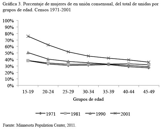 El aumento de la cohabitación se ha dado en todas las edades, pero sobre todo entre las más jóvenes. En 2001 más de la mitad de las uniones en las mujeres de 15 a 29 años eran uniones consensuales y entre aquellas de 30 a 39 años los valores superaban 40 por ciento, cuando en las décadas anteriores alcanzaban apenas 30 por ciento. En el resto de edades, el aumento entre 1990 y 2001 es más discreto, pero cercano a los nueve puntos porcentuales (Gráfica 3).