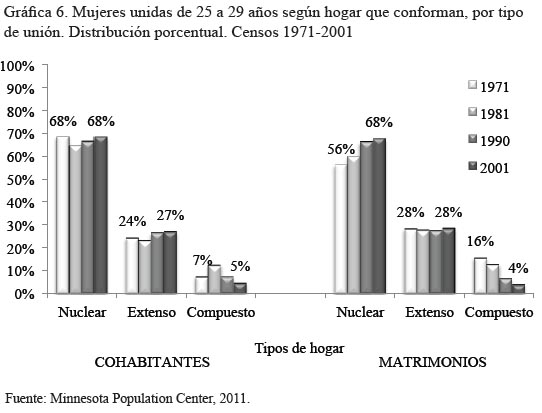 Con independencia del tipo de unión, más de la mitad de las parejas viven en un hogar nuclear, formado por un solo núcleo conyugal con o sin hijos co-residentes. El porcentaje de mujeres cohabitantes que residen en hogares nucleares es cercano a 70 por ciento en todos los censos y se mantiene relativamente estable en el tiempo. Entre las mujeres casadas, el porcentaje crece de 56 a 68 por ciento. En los años 70, las mujeres cohabitantes solían vivir en hogares nucleares en una proporción mayor que las casadas. En cambio, la proporción de mujeres casadas que residían en hogares extensos o compuestos era ligeramente superior a la de las cohabitantes. En los dos primeros censos la diferencia entre cohabitantes y casadas estribaba en la mayor tendencia de las últimas a residir en hogares compuestos. Los hogares compuestos son aquellos en los que existe la presencia de algún no familiar en el hogar.