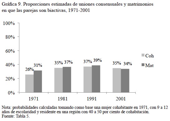 Con independencia del tipo de unión, la situación preponderante siempre superior a 60 por ciento, es aquella en la que el hombre es activo y la mujer se declara inactiva. Sin embargo, la proporción de este tipo de parejas ha disminuido entre 1971 y 2001. Entre las mujeres cohabitantes el porcentaje ha caído de 89 por ciento a 67 por ciento y de 79 por ciento a 59 por ciento entre las casadas. Por tipo de unión, el arreglo tradicional de pareja, en la que el hombre es activo y la mujer no, es más alto entre las parejas cohabitantes que en las casadas. Las parejas biactivas son las segundas en importancia y van claramente al alza en el periodo observado. Entre las cohabitantes han crecido de ocho a 26 por ciento entre 1971 y 2001 y entre las casadas de 18 a 37 por ciento. Las parejas biactivas son más comunes entre las parejas casadas que entre las cohabitantes.