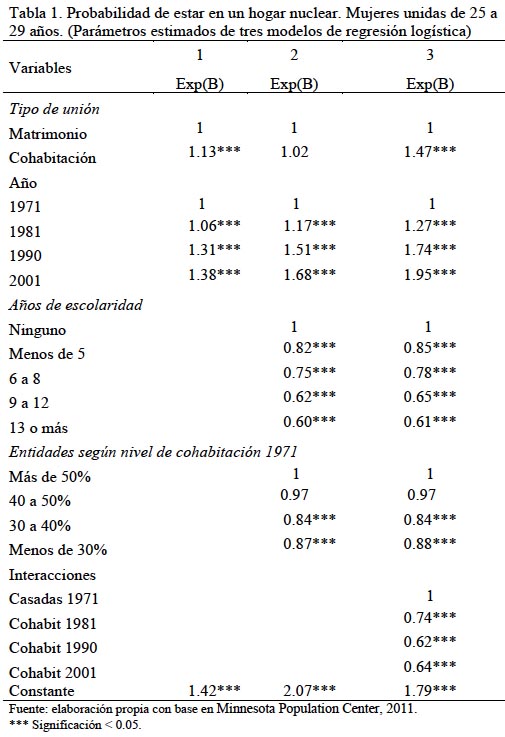 Si en 1971 había mayor proporción de mujeres cohabitantes que residían en hogares nucleares frente a las casadas, con el paso del tiempo la distancia entre matrimonio y cohabitación se redujo significativamente y en 2001 la diferencia entre un grupo y otro es de sólo dos puntos porcentuales. Asimismo se evidencia que al controlar la estructura educativa y territorial inherente a cada grupo, entre los matrimonios el peso de la nuclearización se está acentuando más que entre las cohabitantes.