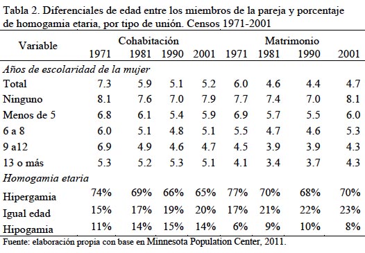 Una manera de aproximarse a los patrones homogámicos en la conformación de las parejas es mirar la diferencia de edad entre los cónyuges (ver Tabla 2). Tal diferencia ha disminuido de 6.5 años en 1971 a cinco años en 2001. Por tipo de unión, las mujeres cohabitantes presentan diferencias de edad con sus cónyuges mayores que las casadas, aunque las diferencias entre cohabitantes y casadas han disminuido en el tiempo (7.3 años vs. seis en 1971 a 5.2 y 4.7 en 2001).